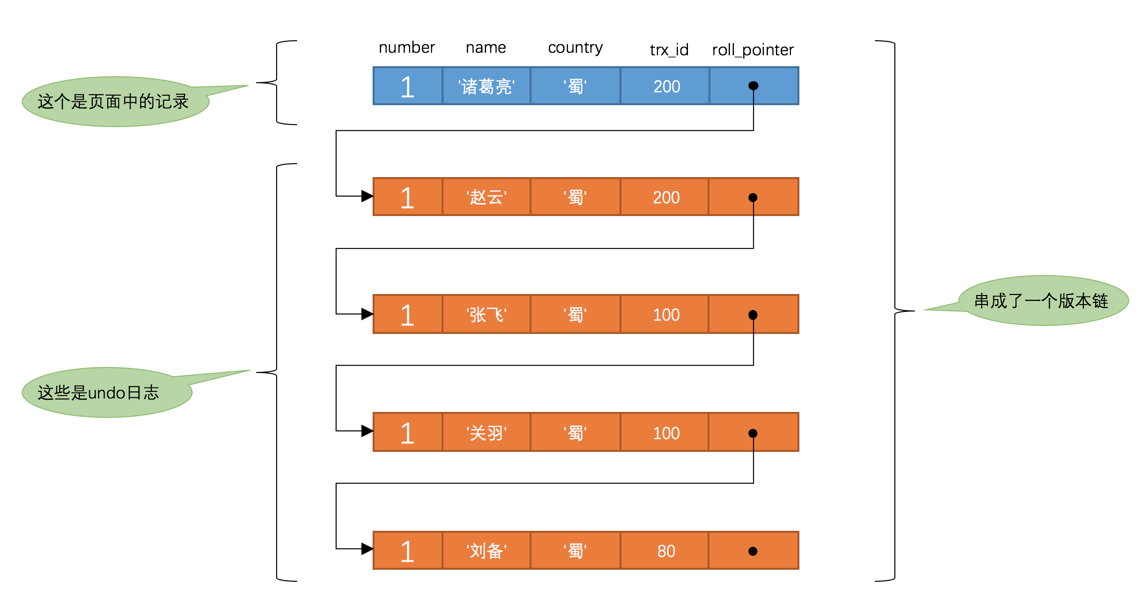 每次对记录进行更新,都会将旧值放入一个新的 undo log 中,这就算是该记录的一个旧版本,undo log 中也有一个 roll_pointer,用来指向更早的 undo log,所以可以形成一个版本链,版本链的头节点就是当前记录最新值: